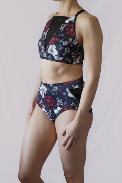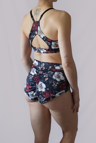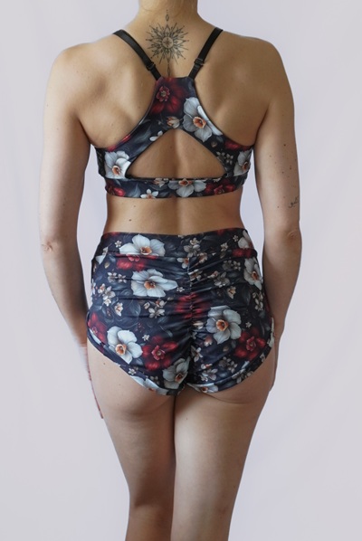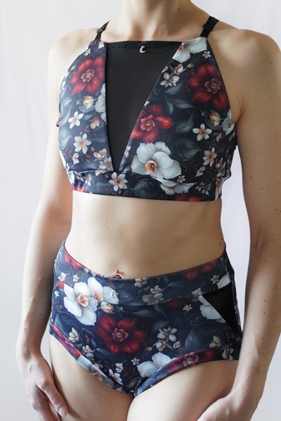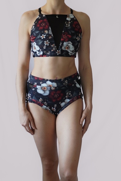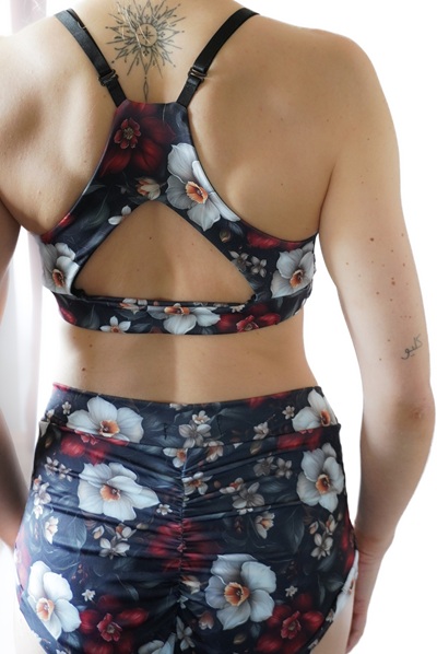 Oberteil aus weichem Lycra mit dunklem Blumen Motiv. Cutout vorne mit schwarzem Mesh kaschiert. CutOut hinten geöffnet