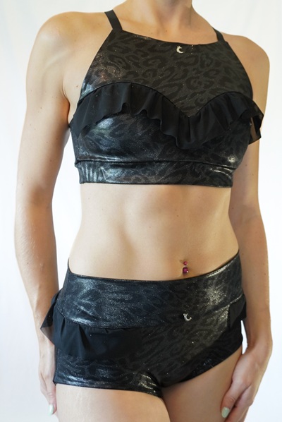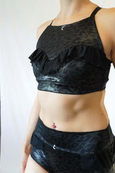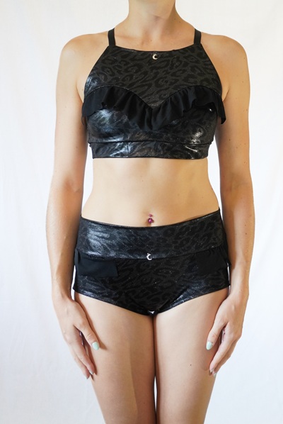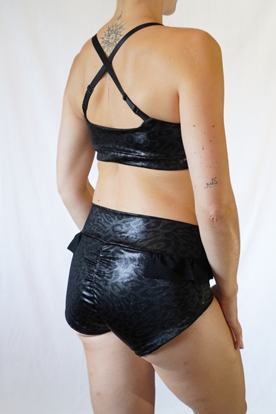 Oberteil aus glänzend beschichtetem Lycra mit dezentem Leo Muster. Dekorative Elemente aus schwarzem Mesh.