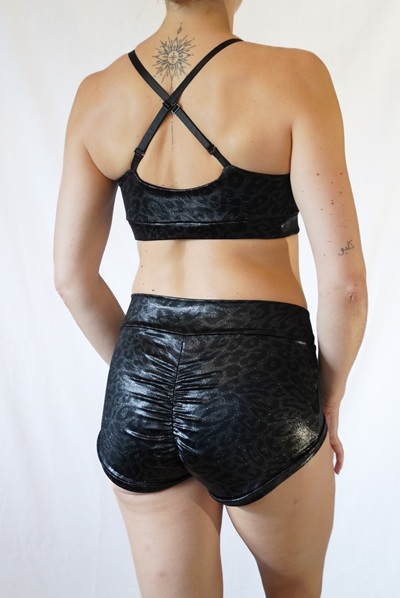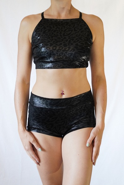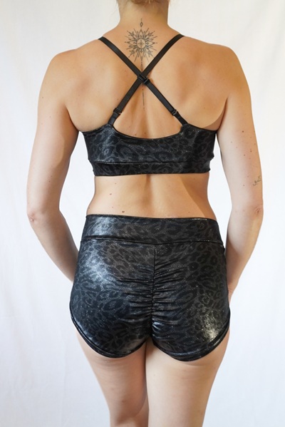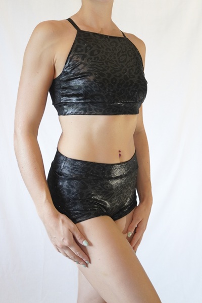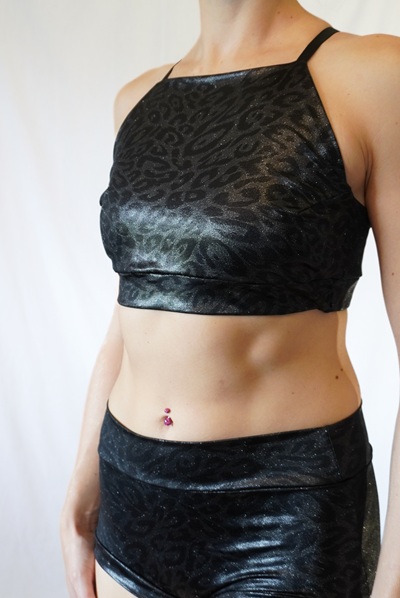 Oberteil aus glänzend beschichtetem Lycra mit dezentem Leo Muster.