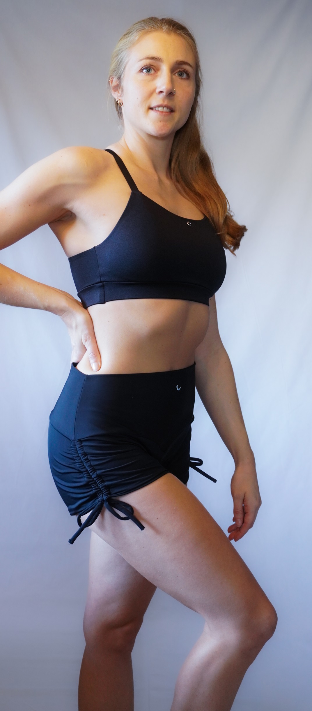 Bestehend aus Lycra in matt-schwarz mit schnürbarer Raffung an den Seiten.